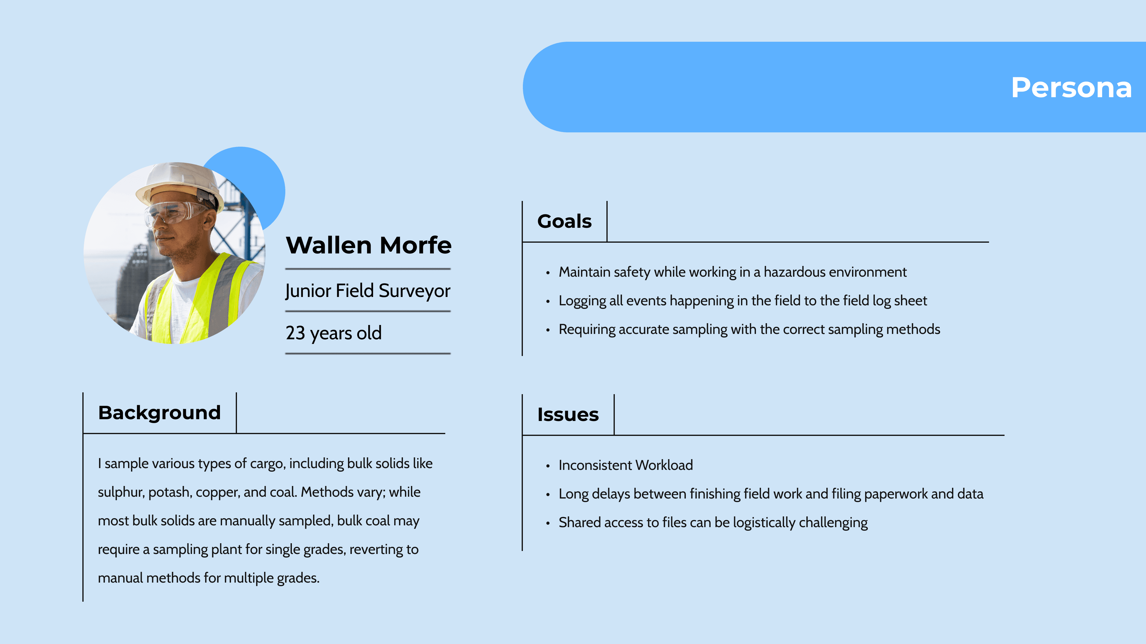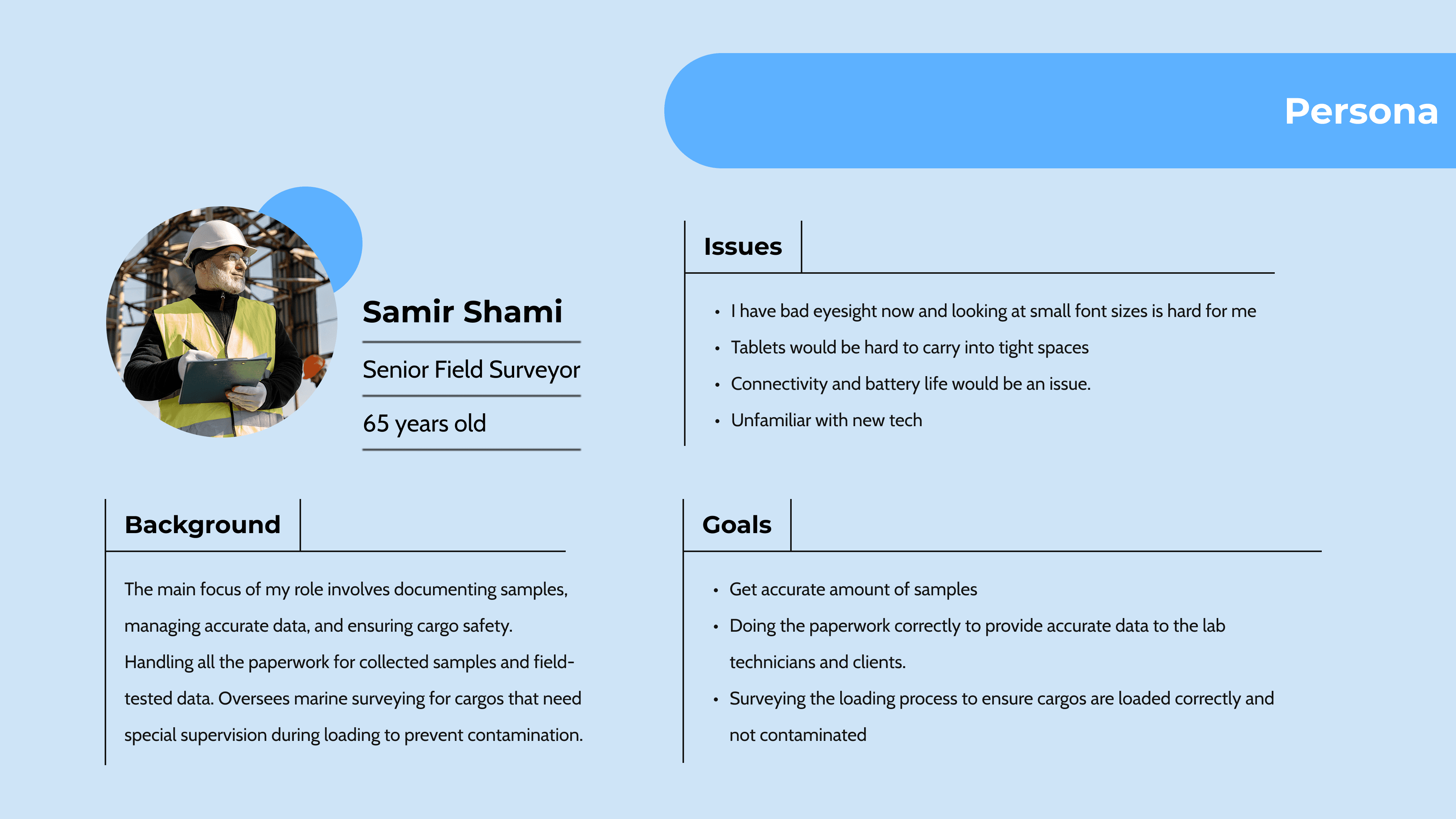 Certispec, a marine surveying company, needed to replace their paper-based note-taking process with a streamlined digital toolkit. This shift would eliminate transcription issues, accelerate reporting, and allow real-time coordination across surveyors, managers, labs, and clients. I partnered closely with their Software Systems Manager, Carson Todd, and multiple field surveyors to shape the solution, running interviews, workshops, and prototype testing sessions that grounded the design in real field conditions.
